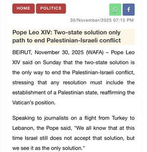 レオ14世教皇は二国家解決への支持を再確認し、パレスチナ国家の樹立を支持し、イスラエルがその道を拒否し続けていることを明確にしました。