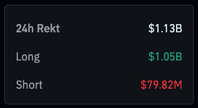 🔻 1,13 milliarder dollar ble likvidert på 24 timer på kryptomarkedet, noe som påvirket 297 911 tradere.