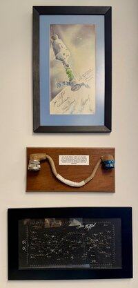 F͟i͟n͟a͟l͟ ͟O͟r͟b͟i͟t͟ sẽ ra mắt vào tuần tới 📕 💫 Đây là cuốn sách tốt nhất của Hadfield cho đến nay, theo ý kiến của tôi. Ông ấy làm rất tốt việc kết hợp kinh nghiệm cá nhân với nghiên cứu lịch sử sâu rộng. Là một phần trong đó, chúng tôi đã đào sâu vào các tài liệu viết của tôi ở Mỹ và Nga cũng như các hiện vật vật lý được trình bày ở đây. Mà không tiết lộ cốt truyện, đây là một số hiện vật anh hùng đóng vai trò hỗ trợ: 1) Cửa Module Lệnh — một bộ phận dự phòng từ một trong những nhiệm vụ bị hủy sau này. Rất hiếm; có lẽ chỉ có hai cái tồn tại bên ngoài tàu vũ trụ đã bay. Và, tôi được cho biết, không có video tốt nào về cách hoạt động của chúng. Vì vậy, tôi đã mang một cái để minh họa cách mở khóa: 2) Kính Nhắm Căn Chỉnh Quang Tàu — một màn hình hiển thị analog rất quan trọng cho việc căn chỉnh khi ghép nối. Cái này đã ở trên mặt trăng ba ngày cho Apollo 16, chi tiết: 3) Dây Umbilical từ Module Lệnh đến Module Ghép Nối đã được sử dụng trong Dự Án Thử Nghiệm Apollo Soyuz, cuộc ghép nối biểu tượng đánh dấu sự kết thúc của cuộc đua không gian. Với bản đồ sao đã bay và các chữ ký, chúng ta thấy một số nhân vật chính trong bi kịch sắp tới. Thêm: Đặt trước sách: