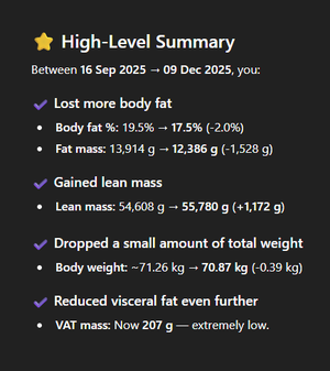 健身更新,结束我这一年的转变: 三个月前,我从整体减重转向脂肪减少 + 增肌(开始举重而不仅仅是做有氧运动),这项减重始于四月(从84公斤减到70公斤)。 我今天做了DEXA扫描,以下是自上次扫描以来大约三个月的结果——我几乎达成了所有目标(减脂、增肌、维持体重、体脂率达到17.x)。 下一个三个月的目标是继续保持我现在的做法(目标至少达到16%的体脂率)。我33岁,身高172厘米,供参考。 对于那些好奇的人,我的做法是: - 每周4-5小时的举重(锻炼所有肌肉群) - 每周3.5小时的有氧运动(85%在2区,15%在4-5区) - 每周1天休息(不可谈判) - 保持一致且高质量的睡眠(每晚8小时,深度+REM睡眠占55%以上) - 95%的时间自己烹饪高质量和营养丰富的食物 - 维持卡路里(通过我的Whoop追踪)并确保每天摄入至少170克蛋白质 老实说,我从未感到如此良好!
