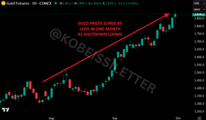 与此同时,黄金预计将录得+10%的月度涨幅,目前年初至今上涨+45%。