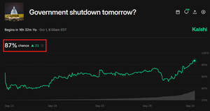 根据Kalshi的数据显示,目前在9小时内发生关门的概率为87%。