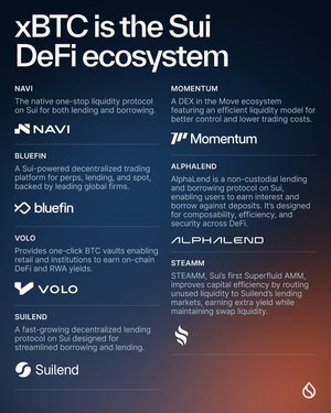 xBTC 現在已接入 Sui DeFi: @navi_protocol, @bluefinapp, @MMTFinance, @suilendprotocol, @volo_sui, @AlphaFiSUI 和 @steammfi。 借入它,流動性提供它,槓桿它,農場它。 Sui 是為了 BTCfi 💧
