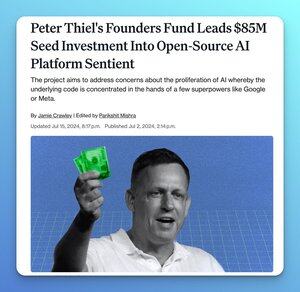 我今天才知道彼得·蒂爾正在支持 @SentientAGI 「彼得·蒂爾的創始人基金領投8500萬美元的種子投資於開源AI平台Sentient」 「該項目旨在解決有關AI擴散的擔憂,因為底層代碼集中在少數幾個超級大國手中,如谷歌或Meta。」